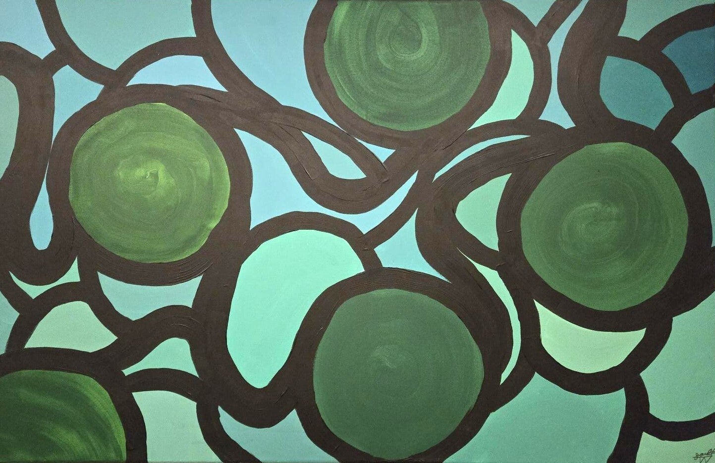 De grands cercles verts émergent comme des ancrages dans le flux mouvant. Ces pois symbolisent les moments lourds et marquants de l’existence, ceux qui façonnent la trajectoire d’une vie.
