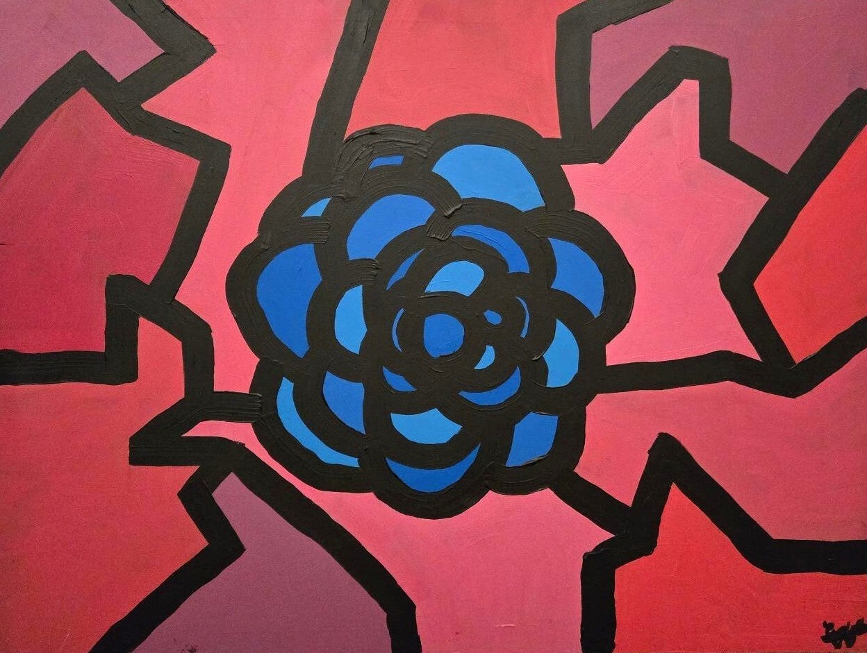 Au centre d’un monde rouge et dur, une fleur bleue se déploie comme un appui. Elle symbolise le calme et l’espoir, ce soutien fragile mais essentiel qui apaise la douleur environnante.